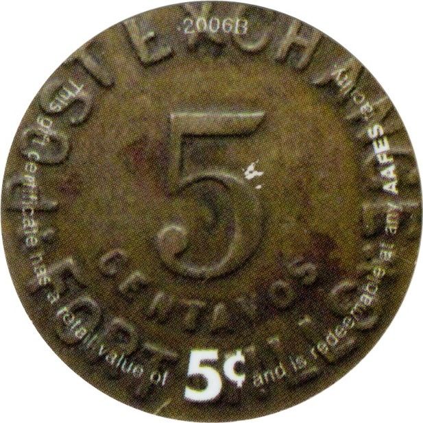 Описание: Зображення військового жетона США номіналом 5 сентаво, випущеного для використання в Кавіті, Корегідорі, Філіппіни.