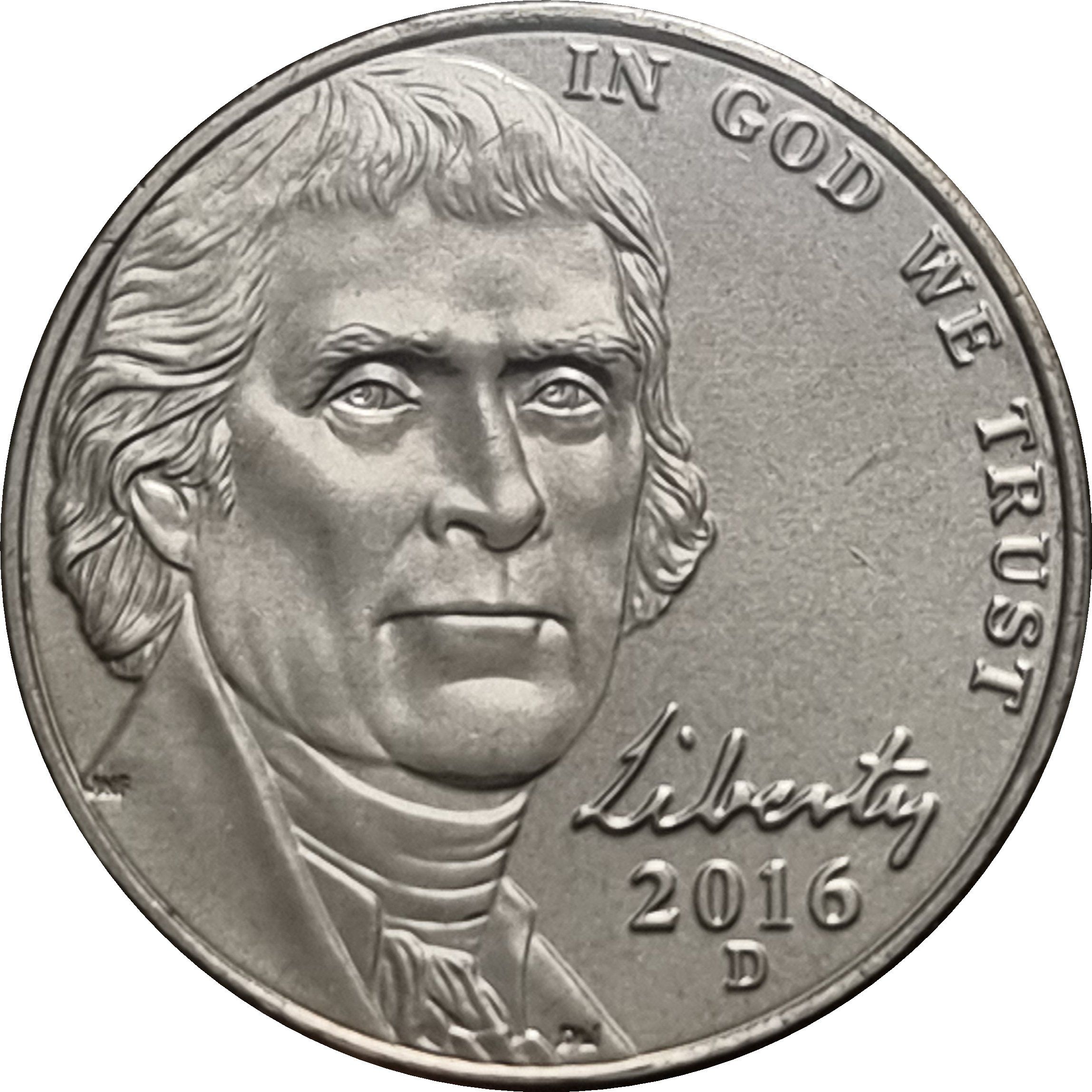 Описание: Портрет Томаса Джефферсона, третьего президента США с 1801 по 1809 год, выполненный в 1800 году Рембрандтом Пилом по эскизу с натуры, обращенный к зрителю, сопровождаемый словом «Свобода», написанным почерком Джефферсона, в окружении девиза: «IN GOD WE TRUST» (Мы верим в Бога).