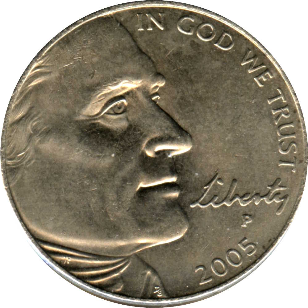 Описание: Портрет Томаса Джефферсона, третьего президента США с 1801 по 1809 год, в профиль справа, сопровождаемый словом «Liberty» (Свобода), написанным рукой самого Джефферсона, окружен девизом: «IN GOD WE TRUST» (Мы верим в Бога).
