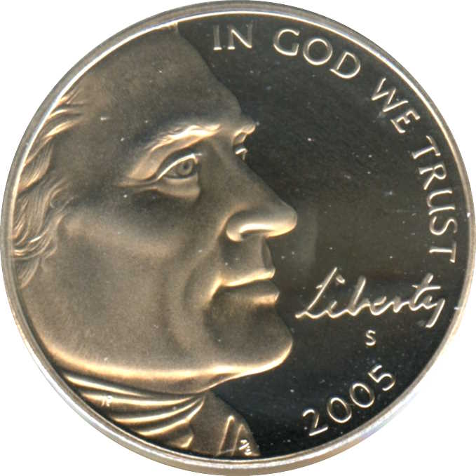 Описание: Портрет Томаса Джефферсона, третьего президента США с 1801 по 1809 год, в профиль справа, сопровождаемый словом «Liberty» (Свобода), написанным рукой самого Джефферсона, окружен девизом: «IN GOD WE TRUST» (Мы верим в Бога).