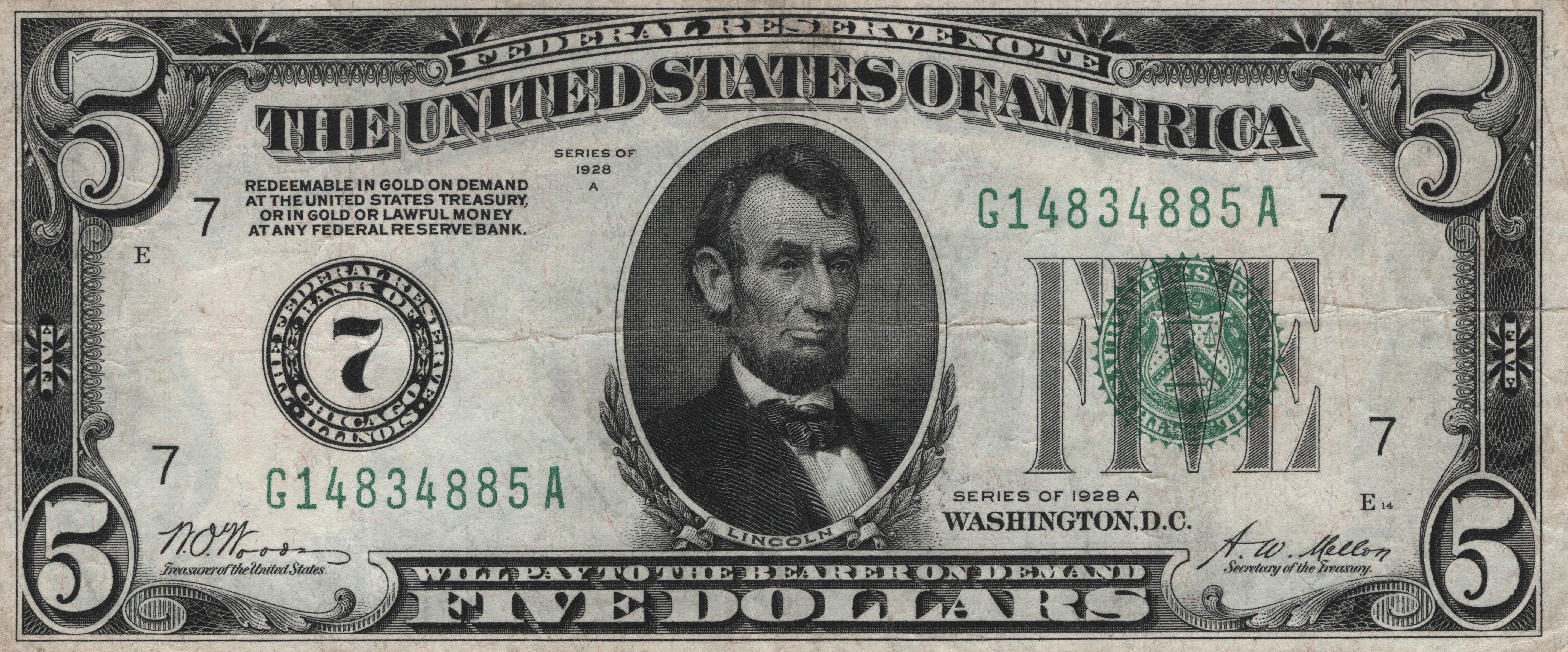 Название: 5 доларів (банкнота Федерального резерву; «Обмінюється на золото»; ідентифікаційний номер відділення в цифрах)