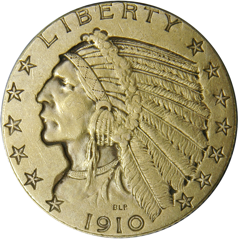Описание: Голова индейца в военном головном уборе, обращенная влево, в углубленном дизайне, дата внизу и звезды по краю.