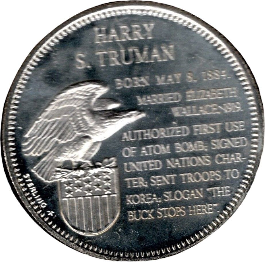 AUTHORIZED FIRST USE OF ATOM BOMB; SIGNED UNITED NATIONS CHARTER; SENT TROOPS TO KOREA; SLOGAN "THE BUCK STOPS HERE".