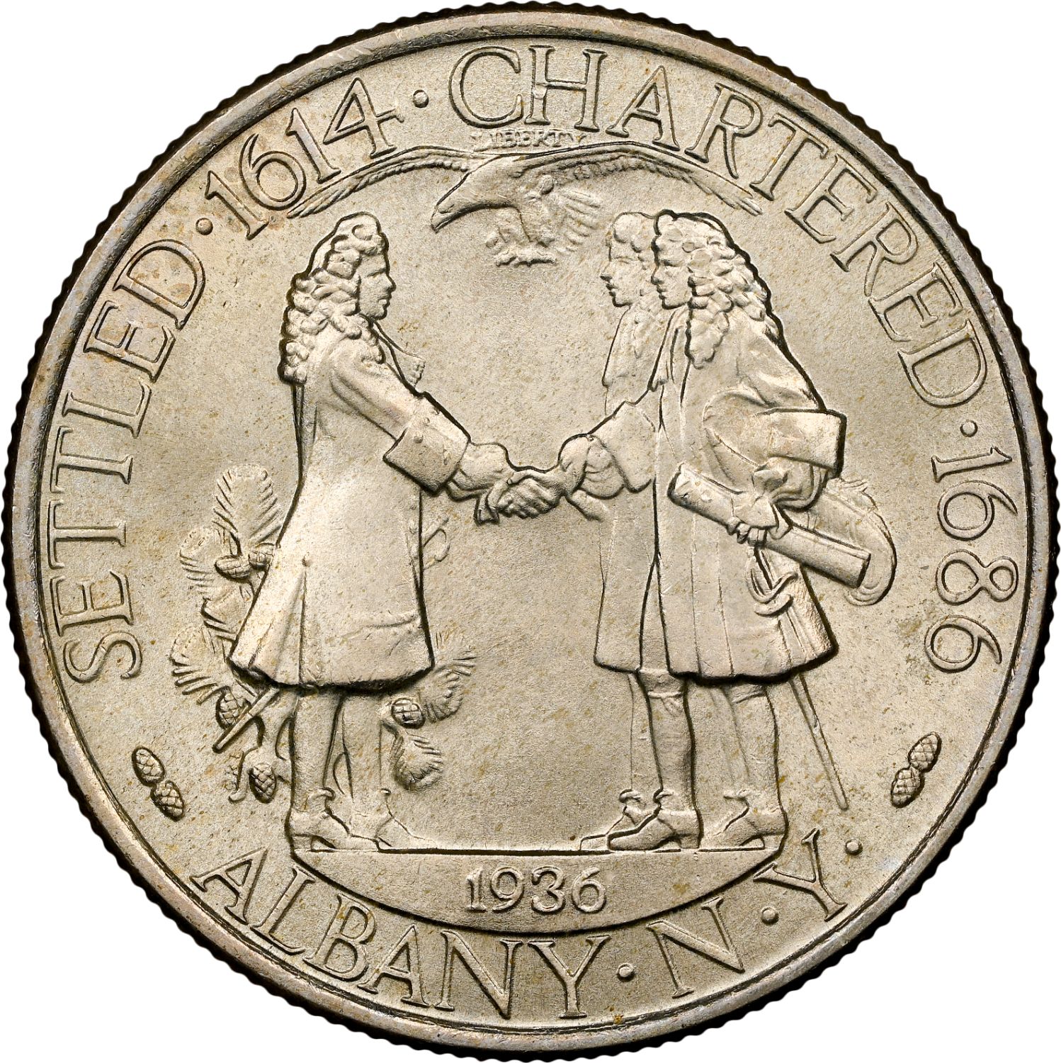 Описание: Колоніальний губернатор сер Томас Донган вручає хартію Пітеру Скайлеру, першому меру Олбані, та Роберту Лівінгстону. Над сценою з’являється орлан у польоті.