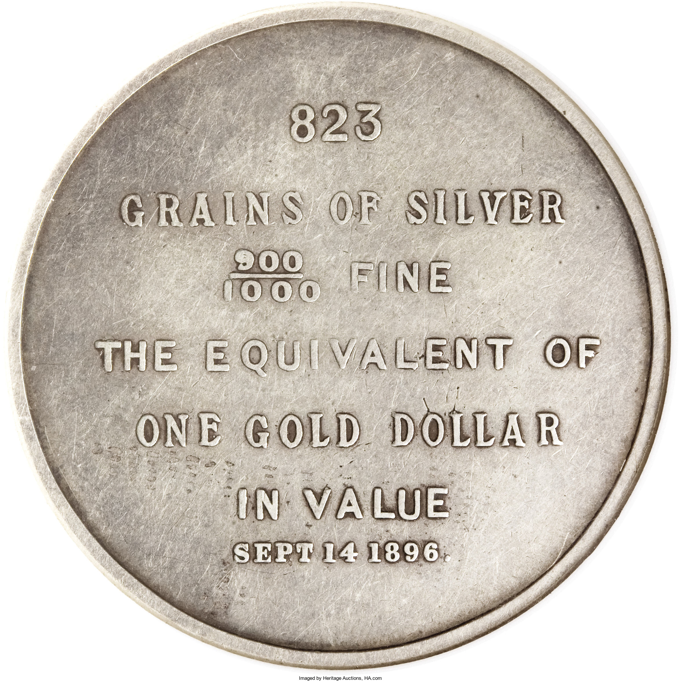 823 / Grains of Silver / 900/1000 Fine / The Equivalent of / One Gold Dollar / in Value / Sept 14 1896