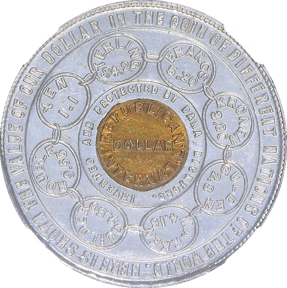 Описание: У центрі кола, «Dollar» у прямій лінії, «Republican» у вигнутій лінії зверху та «Internat.l.» у вигнутій лінії знизу; від центру кола до краю, п'ять рисок, що символізують срібні злитки; починаючи з зовнішнього краю, чотири лінії, що утворюють майже повні кола.