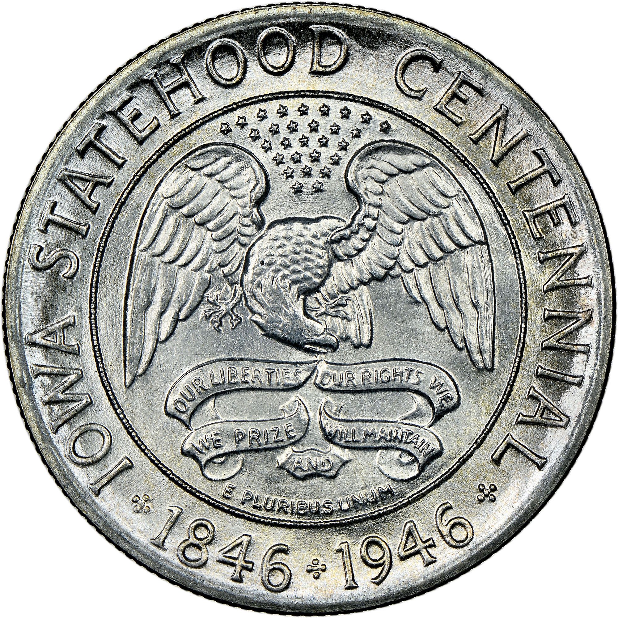 Описание: Орел в круге с свитками в клюве и звездами над головой, с надписью «IOWA STATEHOOD CENTENNIAL» и датами вокруг круга.
