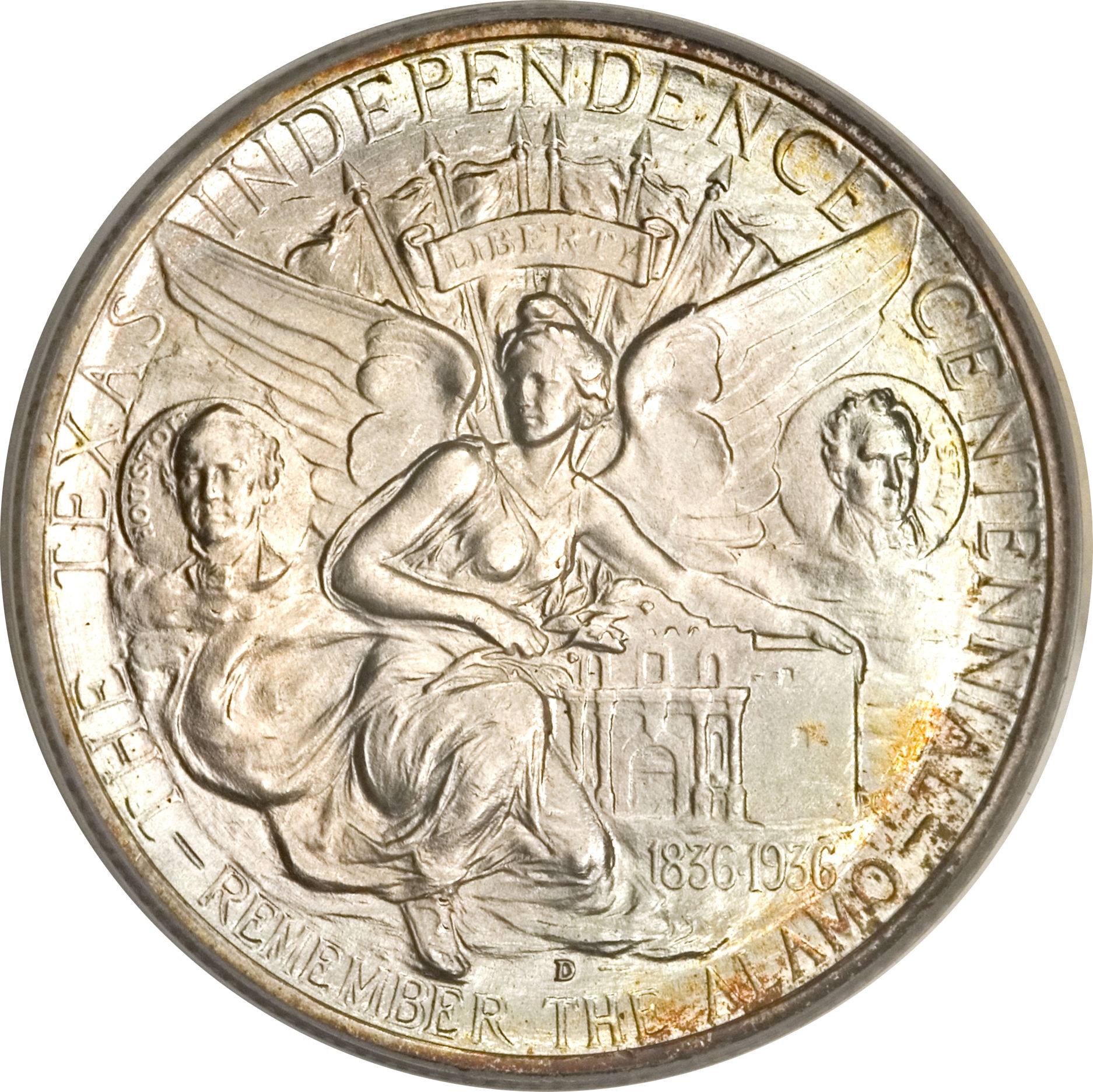Медальйони з портретами генерала Сема Х'юстона, першого президента незалежної Республіки Техас, та Стівена Ф. Остіна, одного з засновників штату, зображені в лівому та правому полях монети. Їхні імена також представлені дуже дрібними літерами. Круговий напис: «Сторіччя незалежності Техасу» та «Пам'ятай Аламо».