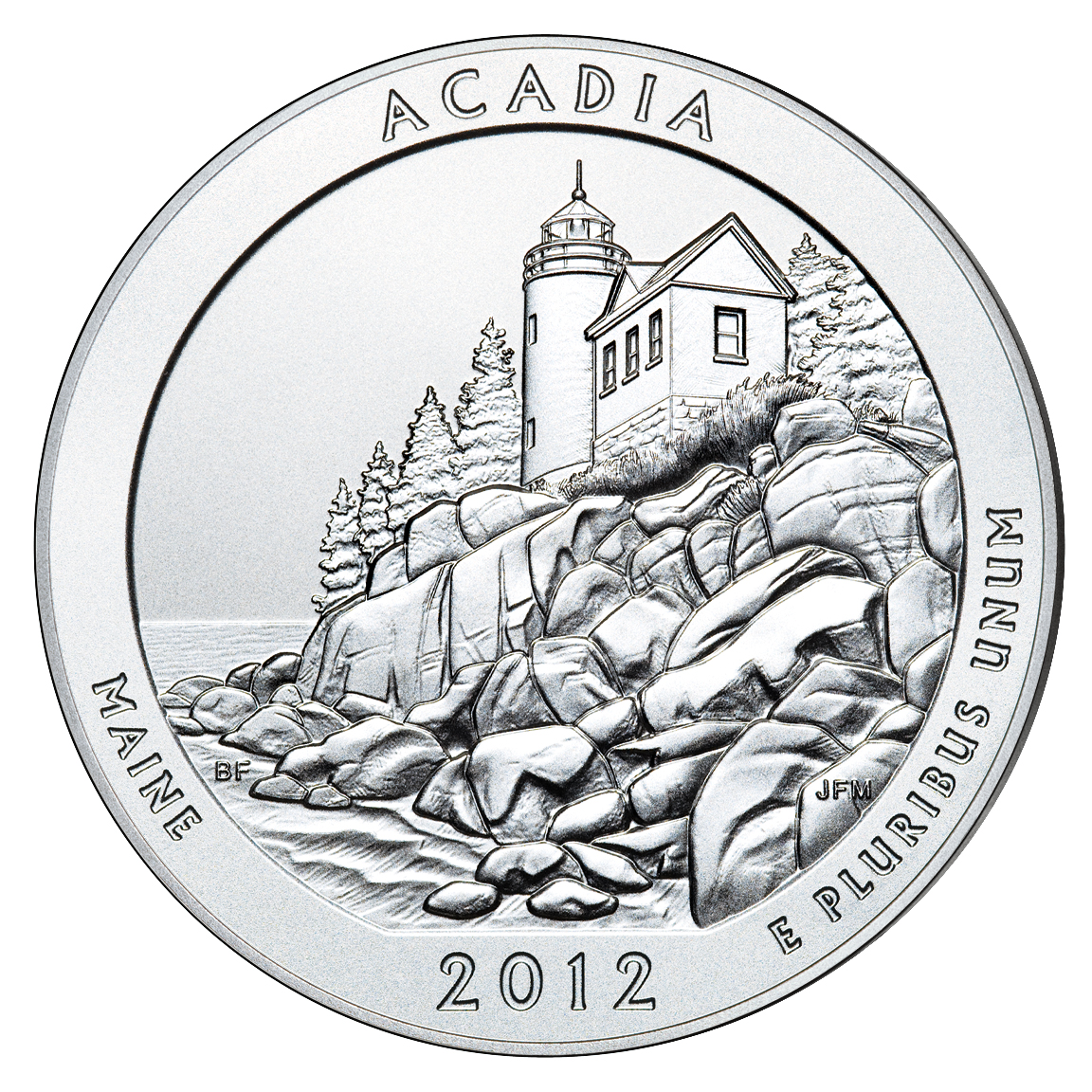 Описание: Вид на маяк Басс-Харбор-Хед и изрезанное побережье Акадии. Дизайн отражает многие характерные элементы Акадии: побережье, маяк, сосны и океан.