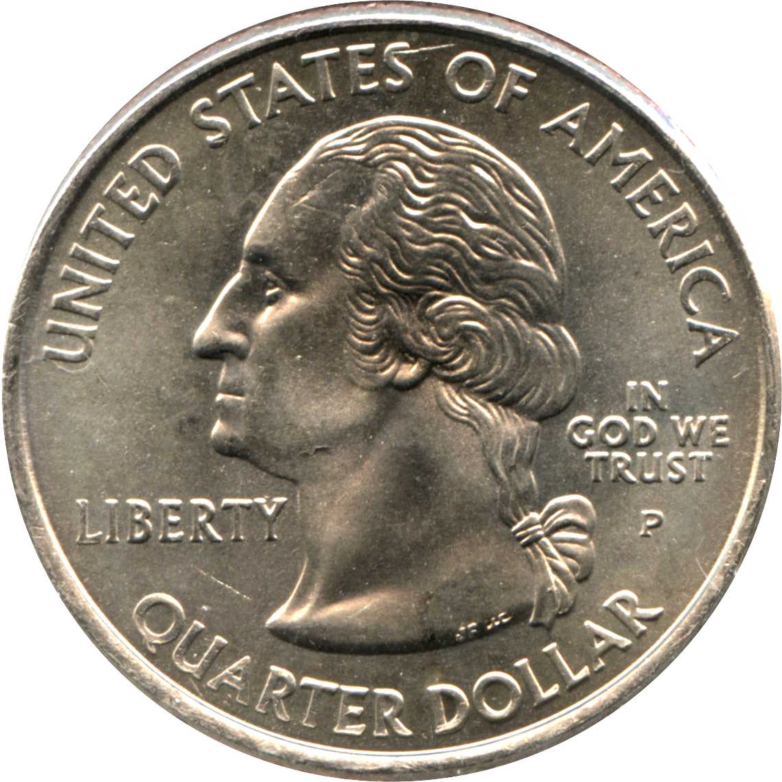 Описание: Портрет Джорджа Вашингтона, первого президента США с 1789 по 1797 год, в профиль слева сопровождается девизом «IN GOD WE TRUST» (Мы верим в Бога) и надписью «LIBERTY» (Свобода) и окружен номиналом и надписью «UNITED STATES OF AMERICA» (Соединенные Штаты Америки).
