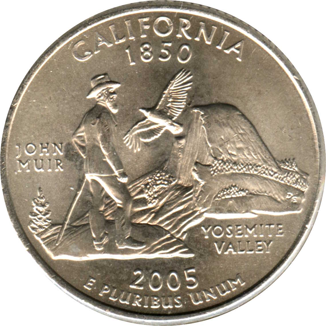 Описание: Натуралист и защитник природы Джон Мьюир любуется монолитной гранитной стеной долины Йосемити и парящим калифорнийским кондором с датой внизу.