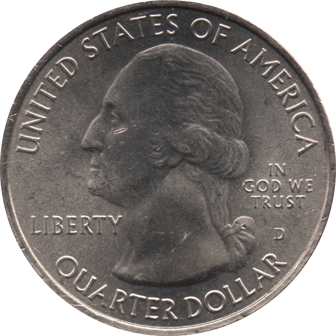 Описание: Портрет в левом профиле Джорджа Вашингтона, первого президента США с 1789 по 1797 год, сопровождается девизом «IN GOD WE TRUST» (Мы верим в Бога) и надписью «LIBERTY» (Свобода), окруженной номиналом и надписью «UNITED STATES OF AMERICA» (Соединенные Штаты Америки), инициалами JF в усечении портрета.