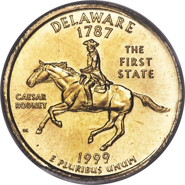 Описание: Цезарь Родни, скачущий на лошади, сопровождается надписью «CAESAR RODNEY», названием штата («DELAWARE»), датой его вступления в Союз («1787»), его прозвищем («THE FIRST STATE») и девизом «E PLURIBUS UNUM».