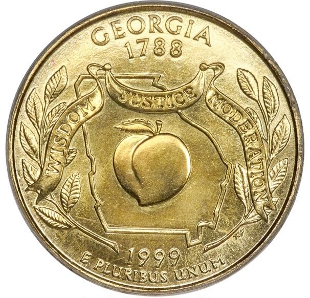 Описание: Персик на фоне географического контура штата сопровождается двумя веточками дуба, символизирующими официальное дерево штата, названием штата («GEORGIA»), датой его вступления в Союз («1788»), девизом «WISDOM JUSTICE MODERATION» на висящем баннере и девизом «E PLURIBUS UNUM».