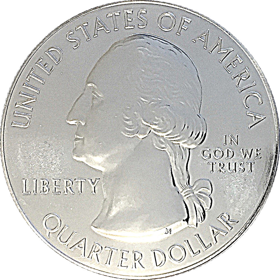 Описание: Портрет Джорджа Вашингтона, первого президента США с 1789 по 1797 год, в профиль слева сопровождается девизом «IN GOD WE TRUST» (Мы верим в Бога) и надписью «LIBERTY» (Свобода), окруженной номиналом и надписью «UNITED STATES OF AMERICA» (Соединенные Штаты Америки).