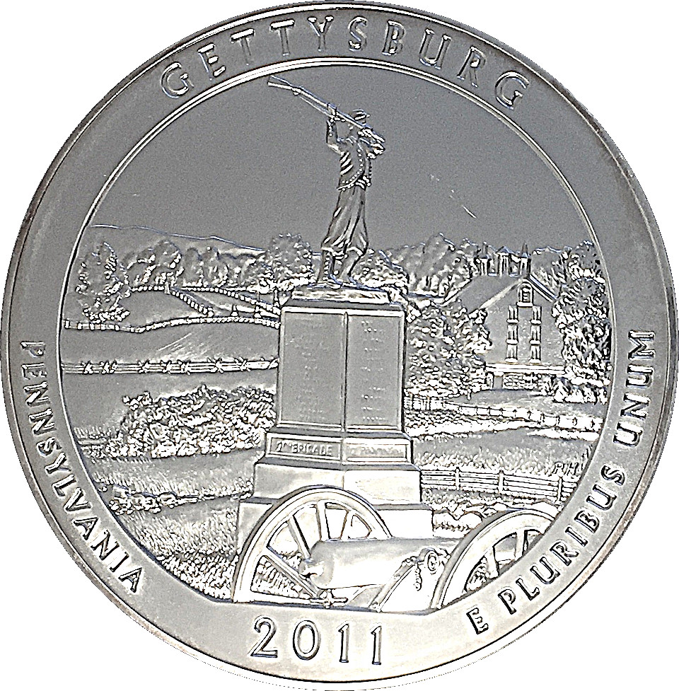 ¼ доллара «Вашингтонский квартал» (Национальный военный парк Геттисберга, Пенсильвания — серебряный слиток 5 унций)