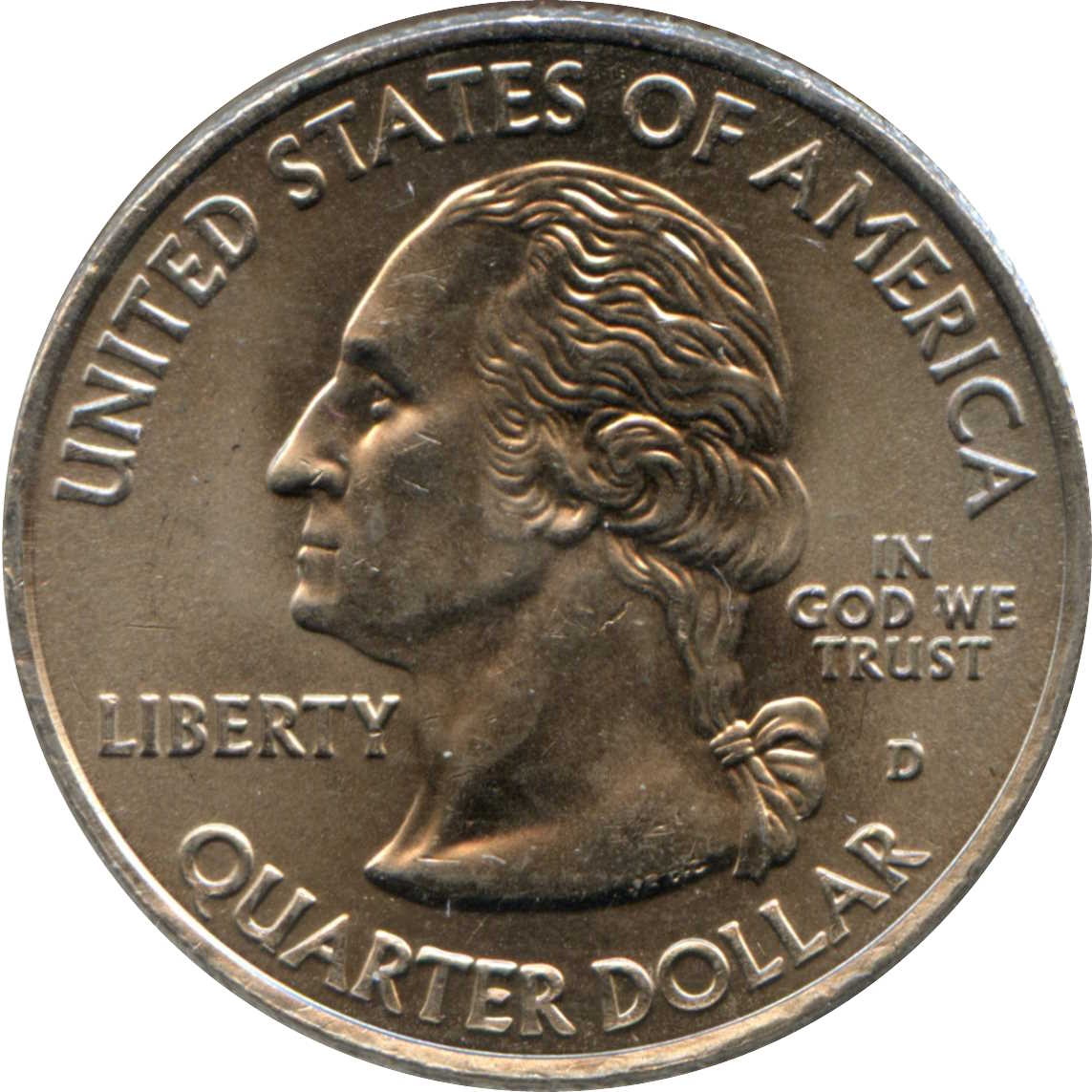 Описание: Портрет Джорджа Вашингтона, первого президента США с 1789 по 1797 год, в профиль слева сопровождается девизом «IN GOD WE TRUST» (Мы верим в Бога) и надписью «LIBERTY» (Свобода) и окружен номиналом и надписью «UNITED STATES OF AMERICA» (Соединенные Штаты Америки).