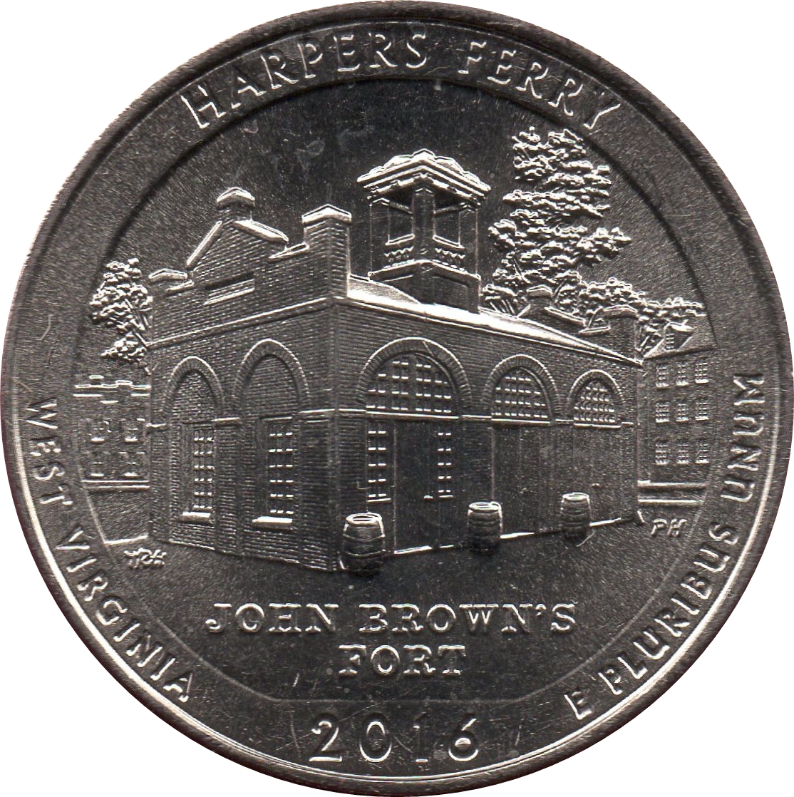 Описание: Форт Джона Брауна, место последнего сражения Джона Брауна во время его нападения на оружейный склад Харперс-Ферри. Надписи: «HARPERS FERRY», «WEST VIRGINIA», «JOHN BROWN'S FORT», «2016» и «E PLURIBUS UNUM».
