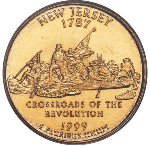 Описание: Изображение генерала Джорджа Вашингтона и членов колониальной армии, пересекающих реку Делавэр на пути к очень важным победам во время Войны за независимость, основанное на картине Эмануэля Лейтце 1851 года, сопровождается надписью «CROSSROADS OF THE REVOLUTION» (Перекресток революции), названием штата («NEW JERSEY»), датой его вступления в Союз («1787») и девизом «E PLURIBUS UNUM».