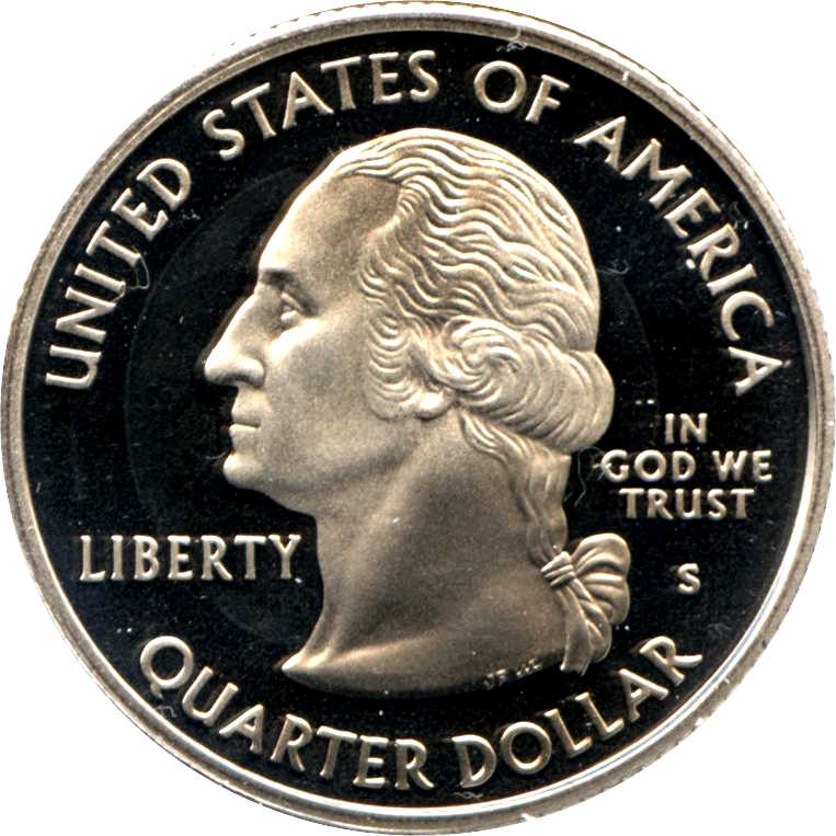 Описание: Портрет Джорджа Вашингтона, первого президента США с 1789 по 1797 год, в профиль слева сопровождается девизом «IN GOD WE TRUST» (Мы верим в Бога) и надписью «LIBERTY» (Свобода) и окружен номиналом и надписью «UNITED STATES OF AMERICA» (Соединенные Штаты Америки).