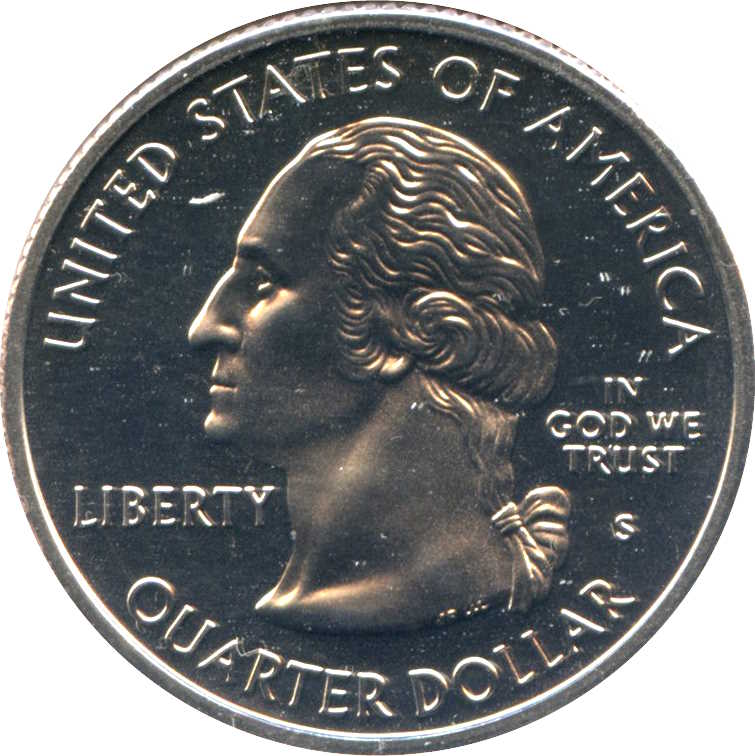 Описание: Портрет Джорджа Вашингтона, первого президента США с 1789 по 1797 год, в профиль слева сопровождается девизом «IN GOD WE TRUST» (Мы верим в Бога) и надписью «LIBERTY» (Свобода) и окружен номиналом и надписью «UNITED STATES OF AMERICA» (Соединенные Штаты Америки).