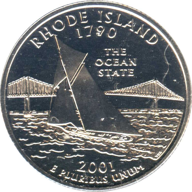 Описание: Винтажная парусная лодка, скользящая по знаменитой бухте Наррагансетт в Род-Айленде, и изображение моста Пелл на заднем плане сопровождаются названием штата («RHODE ISLAND»), датой его вступления в Союз («1790»), его прозвищем («THE OCEAN STATE») и девизом «E PLURIBUS UNUM», разработанным Дэниелом Карром.
