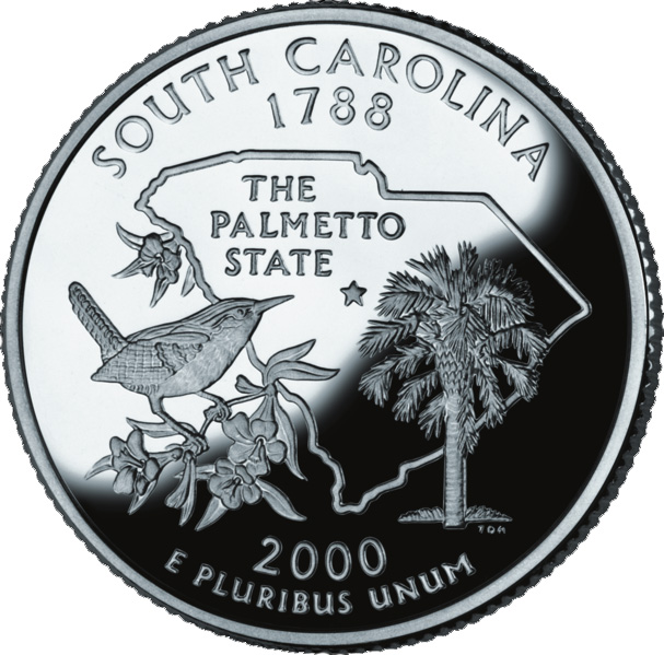 Описание: На монете изображены каролинский крапивник на ветке желтого жасмина и пальметто на фоне контура штата, а также название штата («SOUTH CAROLINA»), дата его вступления в Союз («1788»), его прозвище («THE PALMETTO STATE») и девиз «E PLURIBUS UNUM».