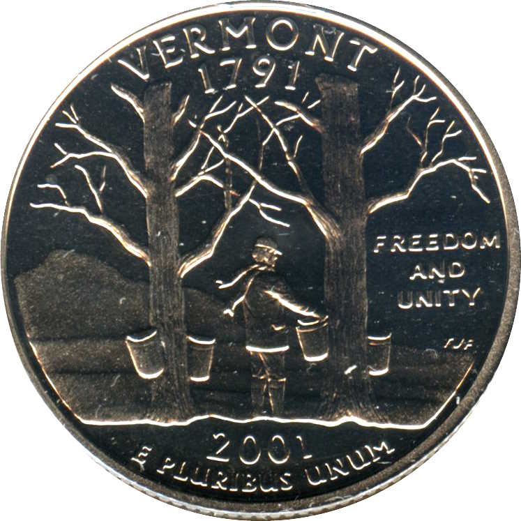 Описание: Кленовые деревья с ведрами для сбора сока перед горой Камелс-Хамп сопровождаются названием штата («VERMONT»), датой его вступления в Союз («1791»), его девизом («FREEDOM AND UNITY») и девизом «E PLURIBUS UNUM».