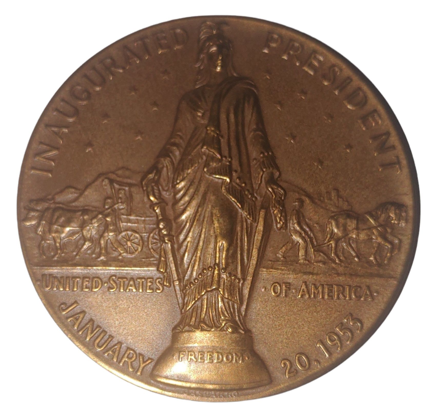 Описание: Статуя ліди, одягнена в мантію та шолом, з написом FREEDOM (СВОБОДА) на постаменті, що розділяє візок, запряжений парою волів (що символізує американську експансію на захід), зліва, та сцену з оранкою поля, що символізує американське сільське господарство, справа. 13 зірок на полі позаду символізують 13 перших колоній.