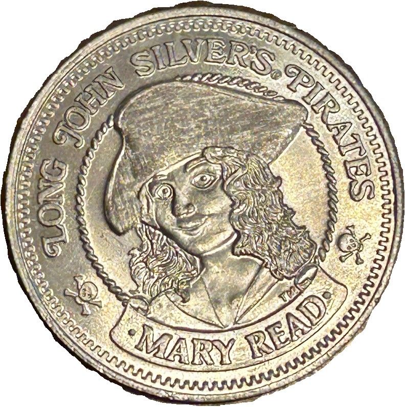 Описание: «Long John Silver's Pirates» (Пірати Лонга Джона Сільвера) у верхній частині, голова Мері Рід у центрі, «Mary Read» (Мері Рід) у нижній частині.