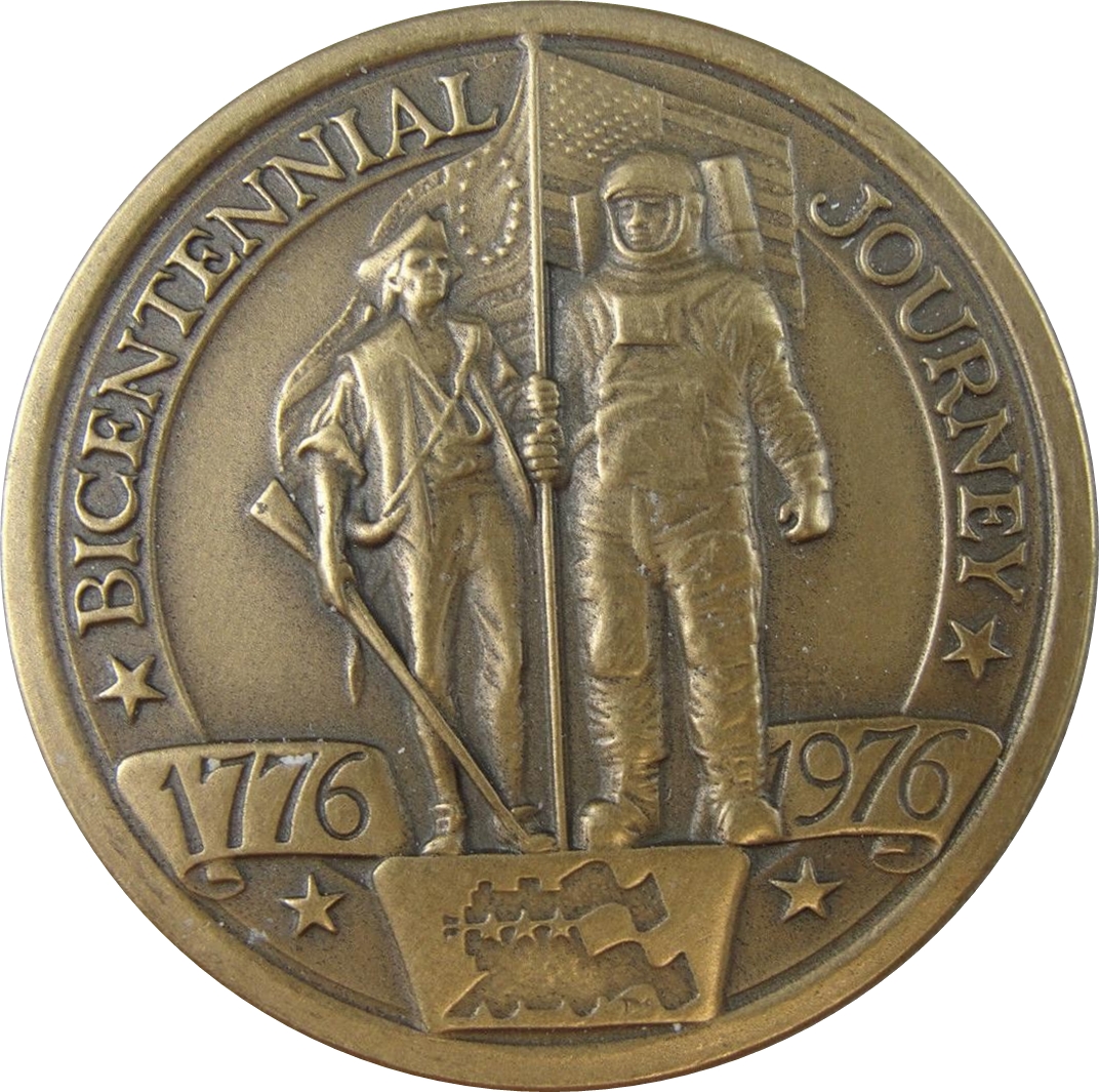 Описание: Мінутмен і місячний астронавт тримають відповідні прапори США. По верхньому краю дугою: BICENTENNIAL JOURNEY (Двохсотрічна подорож). Дати розділені стоячими фігурами.