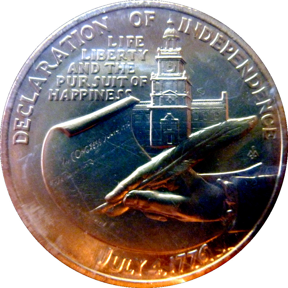 Описание: Зображення Залу незалежності на задньому плані з Декларацією незалежності на передньому плані та рукою, що тримає перо.