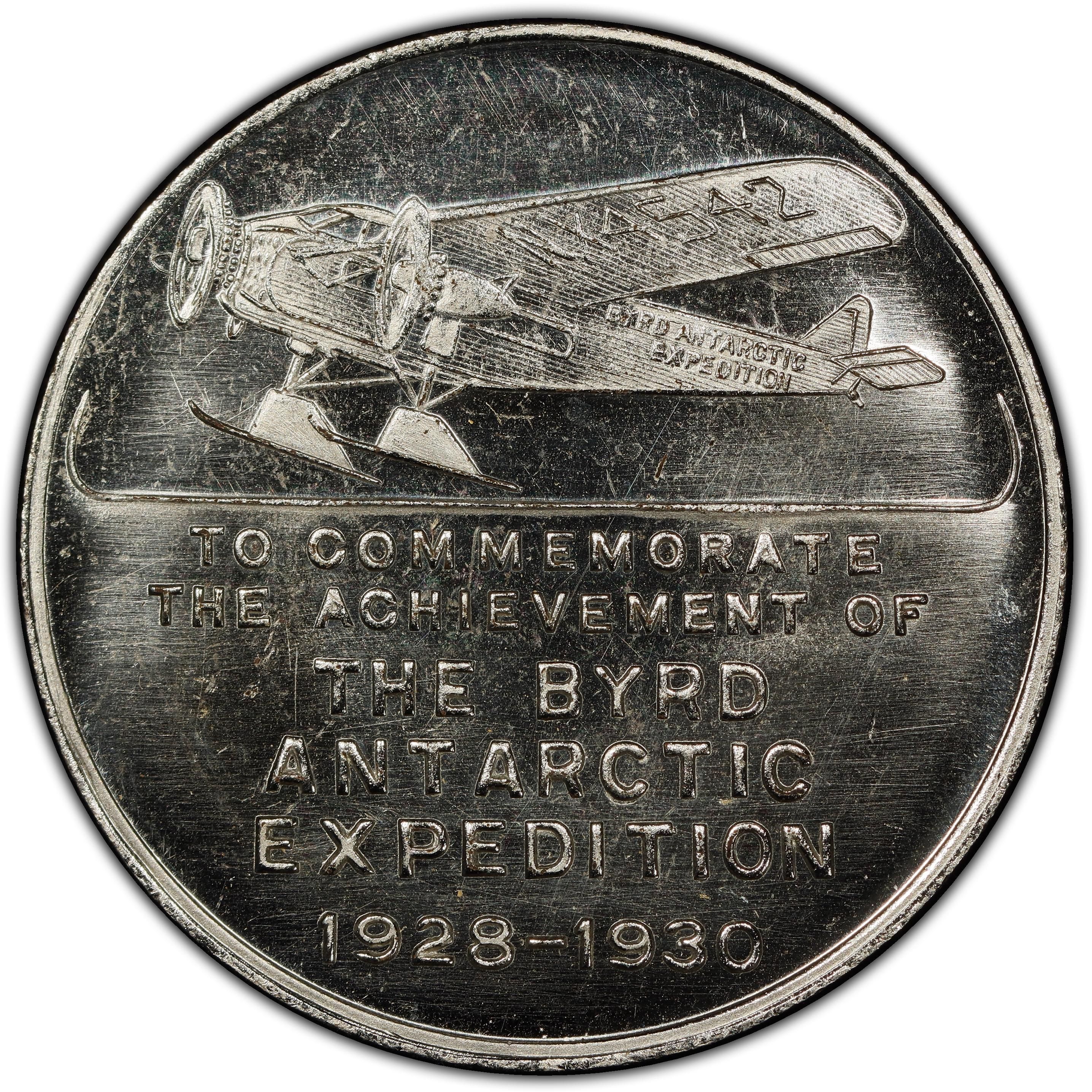 Описание: Стиль колеса воза з легендою по зовнішньому периметру. Американський щит перед зображенням профілю контр-адмірала Річарда Е. Берда в уніформі.