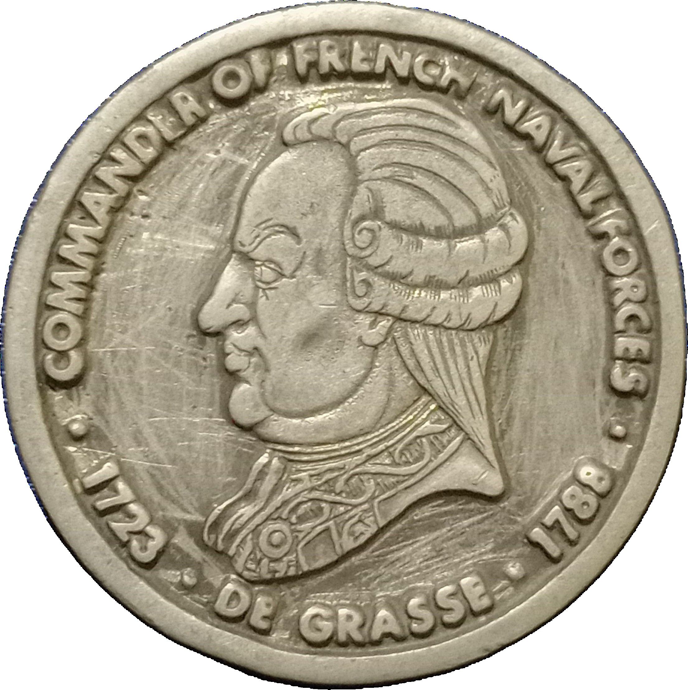 Описание: Профільний портрет адмірала Франсуа Жозефа Поля де Грасса, зверненого ліворуч, в перуці 18 століття та ошатному військовому одязі. По краю — напис.