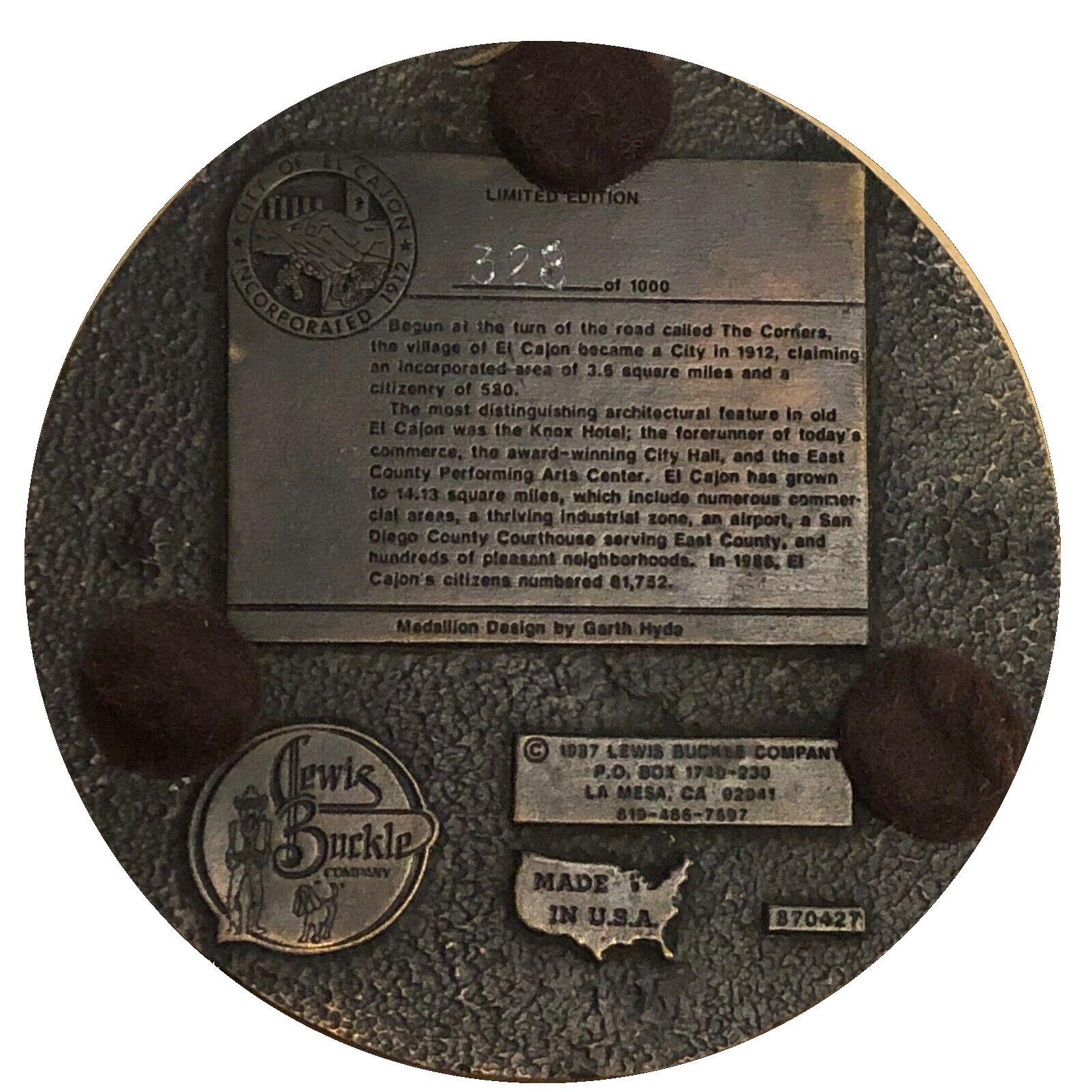 Описание: Печатка міста Ель-Кахон над інформацією, логотип компанії Lewis Buckle Company та логотип MADE IN USA під нею.