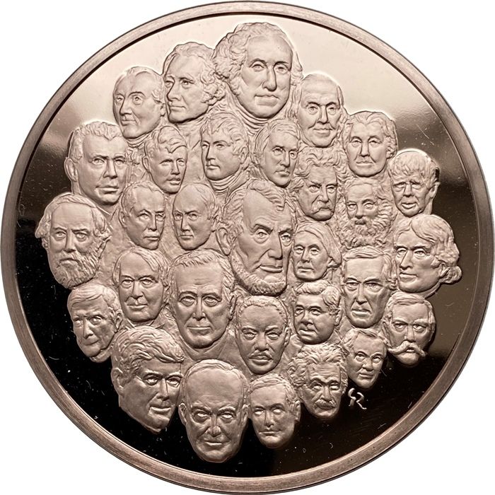Описание: Зображення тридцяти відомих американців, серед яких Вашингтон, Джефферсон, Франклін, Гамільтон, Беб Рут, Лінкольн, Сьюзан Б. Ентоні, Марк Твен, Ейнштейн, Генрі Форд...