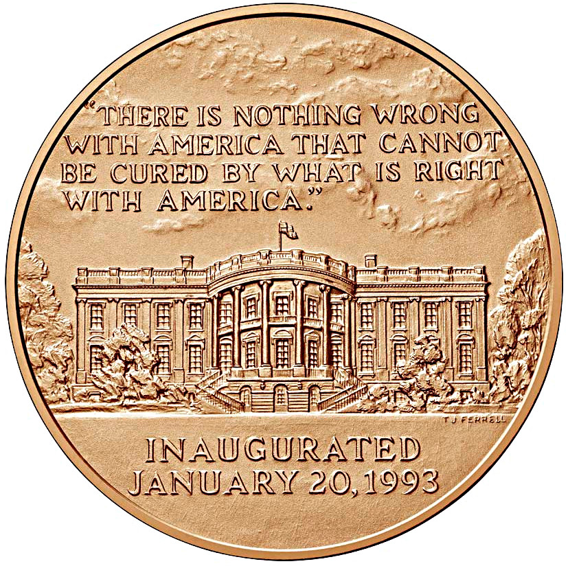 Описание: На зворотному боці медалі зображено південний портик Білого дому та уривок з інавгураційної промови президента Клінтона: