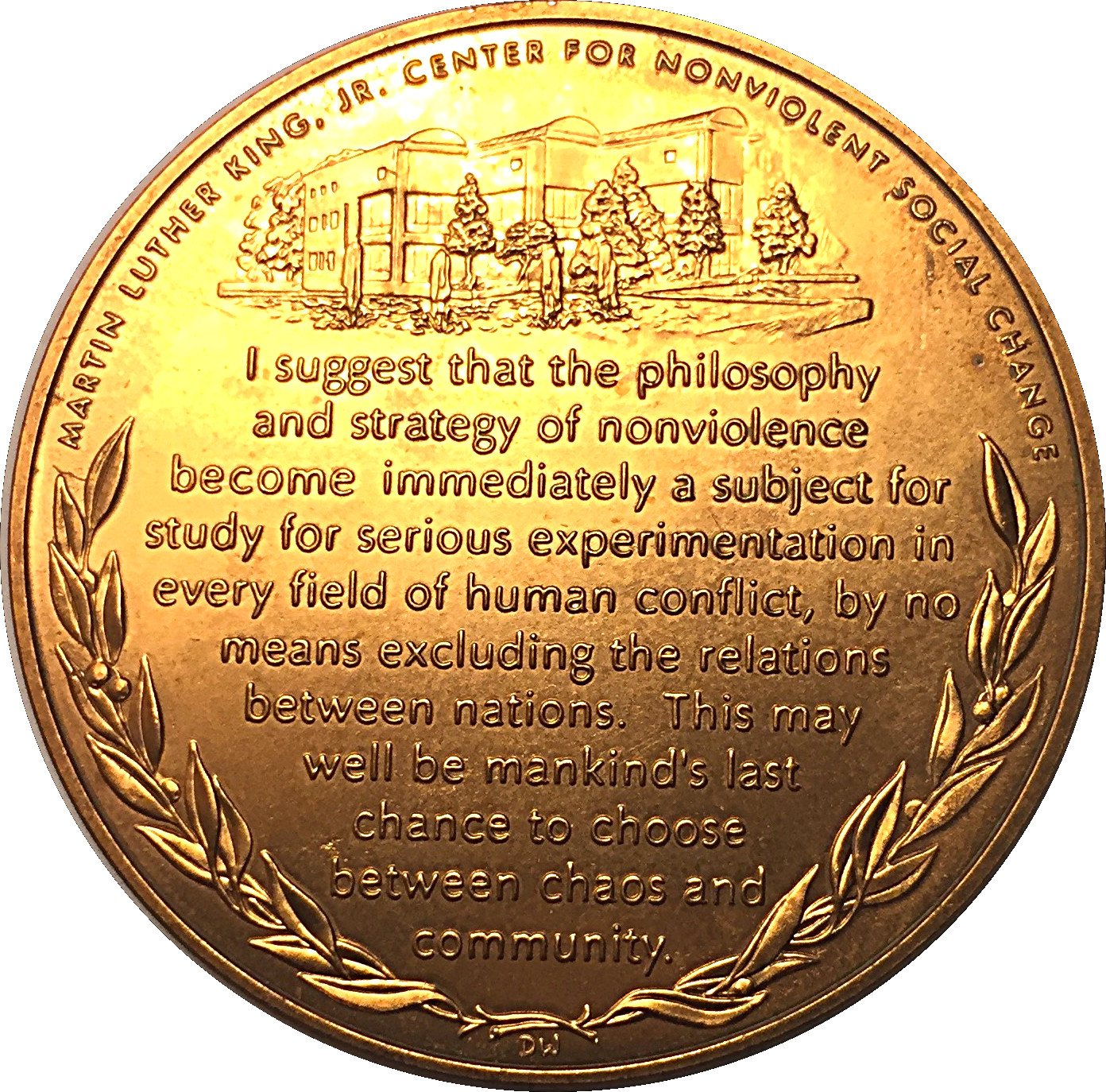 Описание: На зворотному боці (реверсі) зображено Центр ненасильницьких соціальних змін імені Мартіна Лютера Кінга-молодшого, який залишається офіційною спадщиною мрії доктора Кінга про ненасильницькі соціальні зміни та повні громадянські права для всіх американців. Під зображенням центру розміщено цитату, що відображає доктрину доктора Кінга про ненасильницькі соціальні зміни. Нижня половина медалі оточена лавровим вінком.