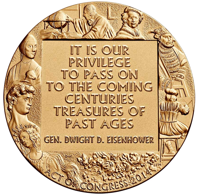Описание: На аверсі зображено солдатів у бою, які піднімають і вивозять предмети з печери або шахти, де «Люди пам'яток» виявили викрадені твори мистецтва.