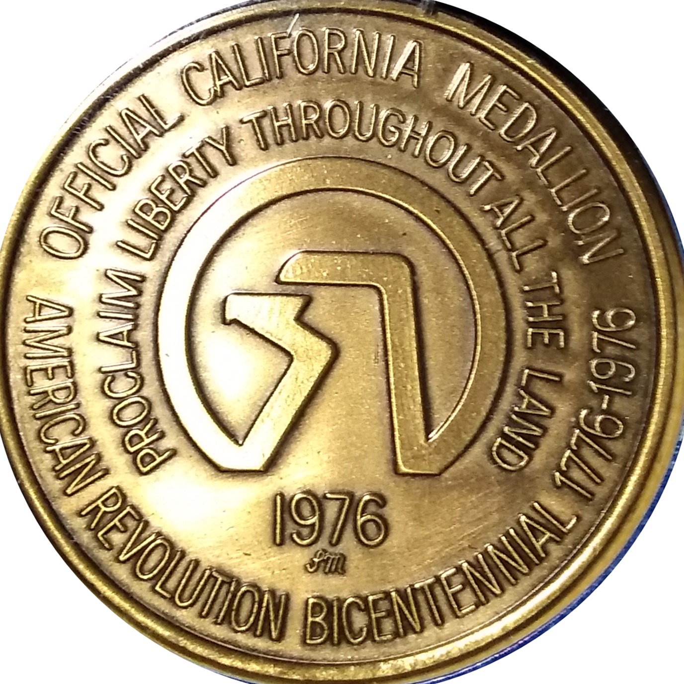 Описание: Напис по колу по краю; логотип Комісії з відзначення 200-річчя Американської революції в Каліфорнії в центрі; рельєфний край.