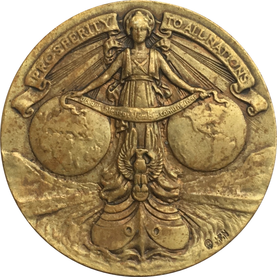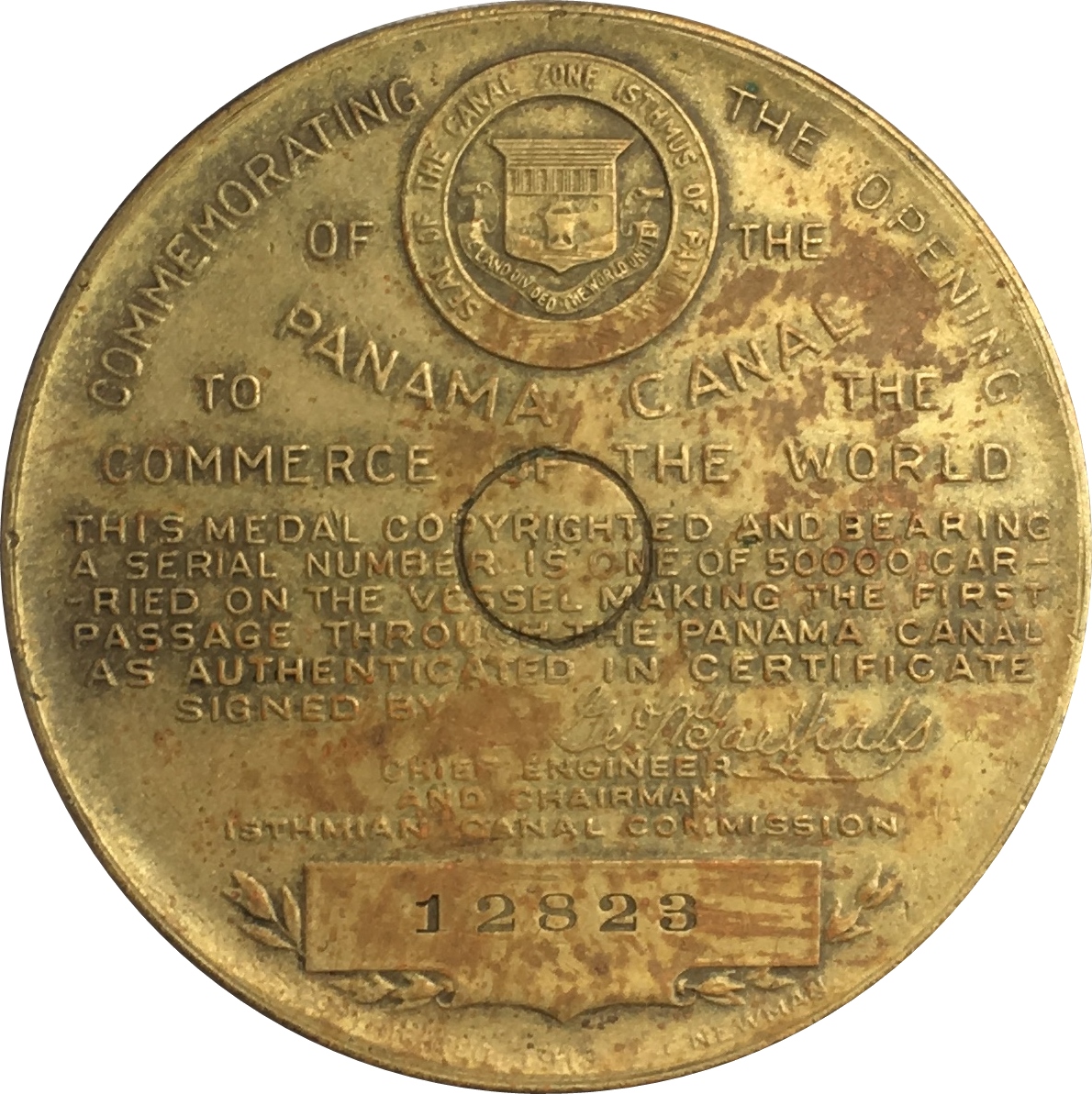 THIS MEDAL COPYRIGHTED AND BEARING / A SERIAL NUMBER IS ONE OF 50000 CAR / -RIED ON THE VESSEL MAKING THE FIRST / PASSAGE THROUGH THE PANAMA CANAL / AS AUTHENTICATED IN CERTIFICATE / SIGNED BY / GEO. W. GOETHALS / CHIEF ENGINEER / AND CHAIRMAN / ISTHMIAN CANAL COMMISSION