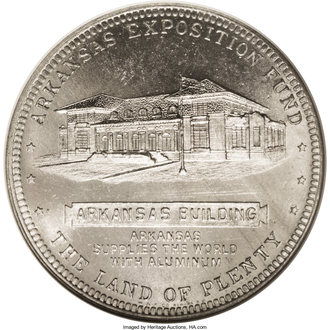 Arkansas Building / Arkansas / Supplies the World / With Aluminum * * Arkansas Exposition Fund * * * The Land of Plenty W & H Co. [Whitehead & Hoag Co.] Newark N J