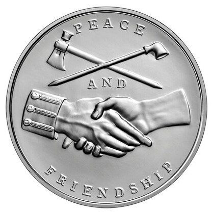 Описание: На реверсе медали находится надпись «МИР И ДРУЖБА», символизируемая двумя сцепленными в знак дружбы руками. На манжете левого запястья изображены три полосы с пуговицами, на каждой из которых изображен американский орел; другое запястье оставлено открытым. Над руками перекрещены трубка мира и томагавк.