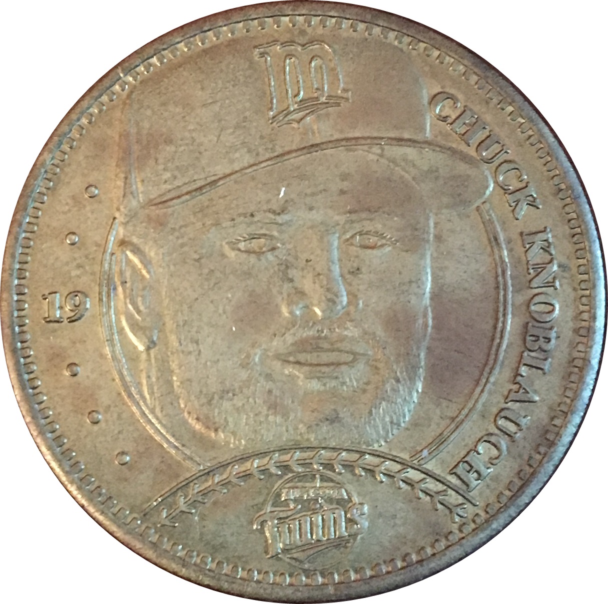 Описание: У центрі зображено бюст Чака Кноблауха в кепці «Міннесота Твінс». Логотип «Твінс» на бейсбольному м'ячі під бюстом.