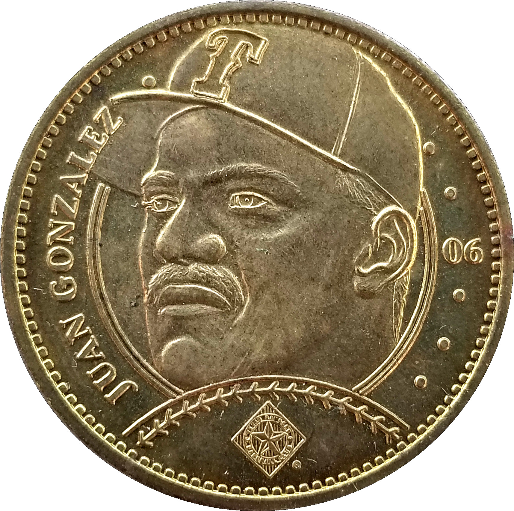 Описание: У центрі зображено бюст Хуана Гонсалеса в капелюсі «Техас Рейнджерс». Логотип «Рейнджерс» на бейсбольному м'ячі під бюстом.