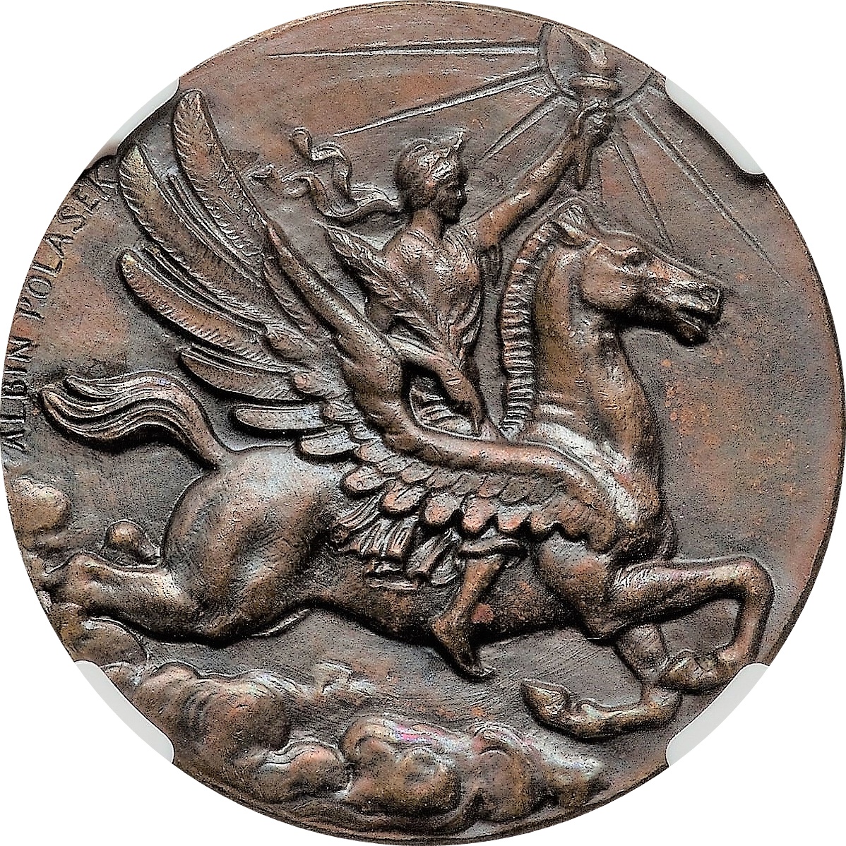 Описание: Свобода, з факелом перед сонцем у піднятій лівій руці та пальмовою гілкою в правій, летить на крилатому Пегасі вправо.