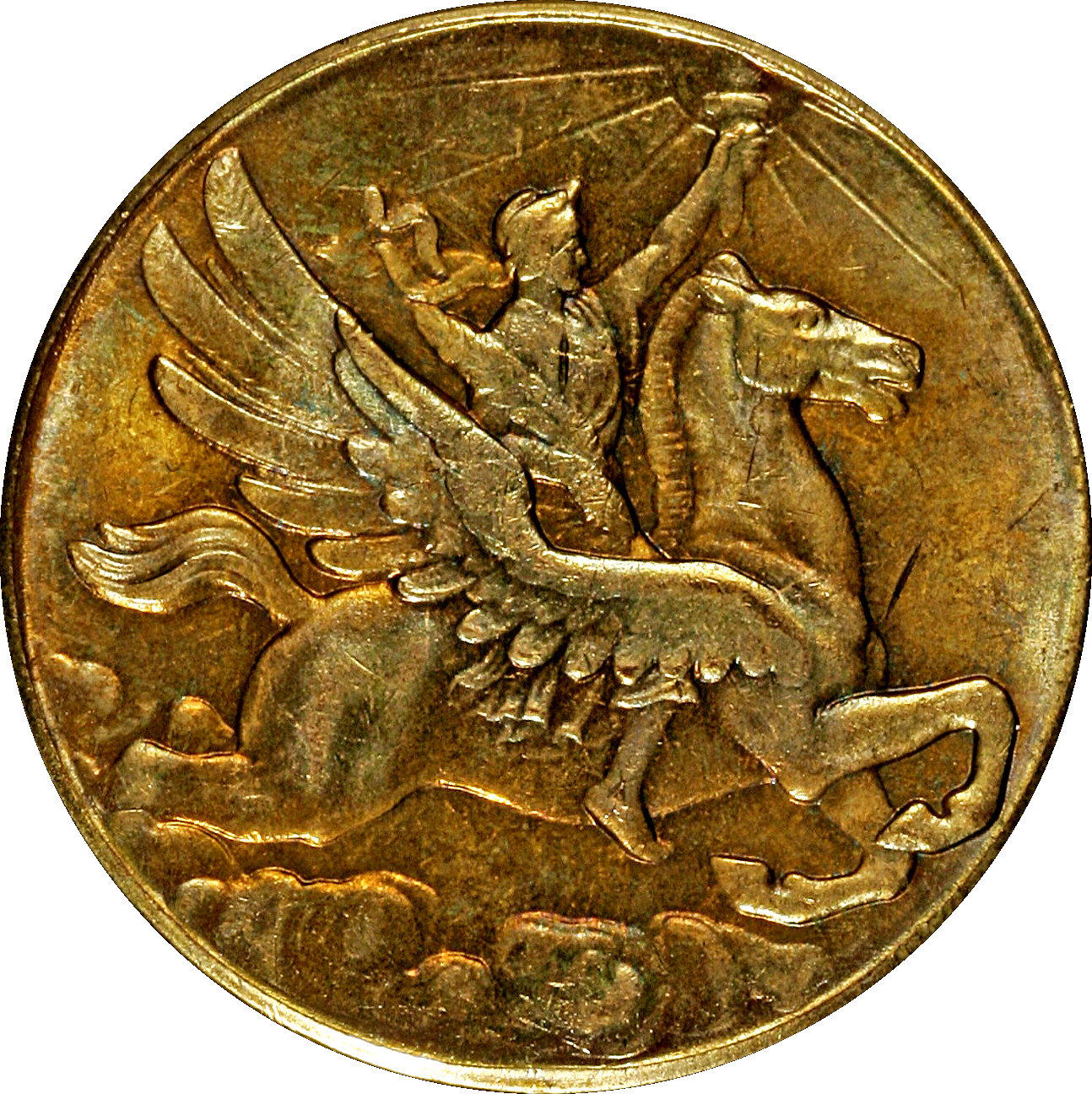 Описание: Свобода, з факелом перед сонцем у піднятій лівій руці та пальмовою гілкою в правій, летить на крилатому Пегасі праворуч над хмарами; факел тримається між сонцем і променями.