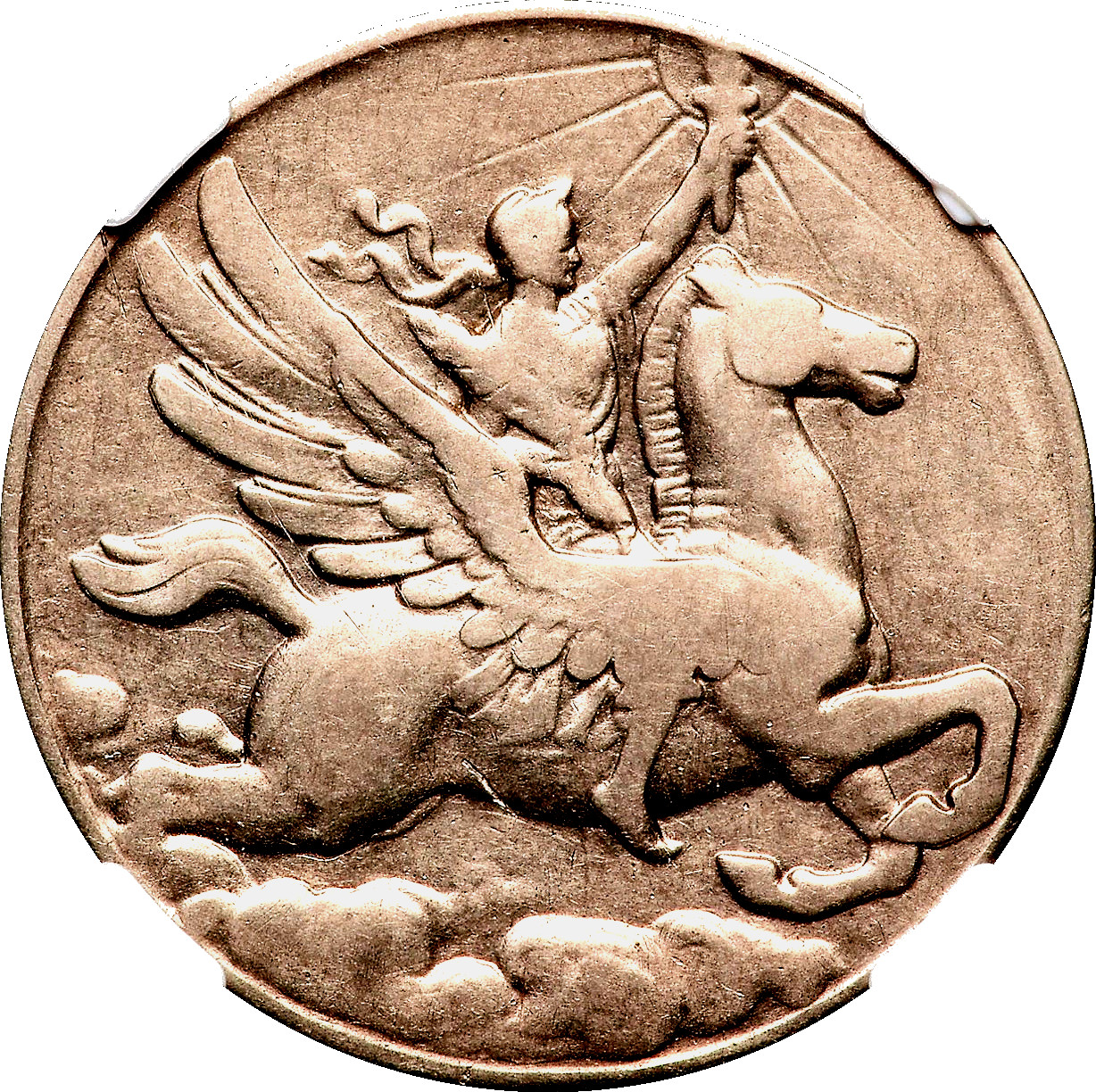 Описание: Свобода, з піднятою лівою рукою, що тримає факел, і пальмовою гілкою в правій, летить на крилатому Пегасі праворуч над хмарами; факел тримається між сонцем і променями.