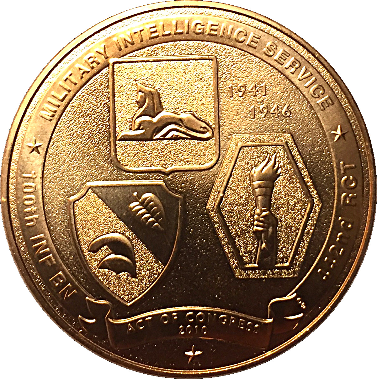 Описание: На зворотному боці (реверсі) зображені емблеми 100-го піхотного батальйону, 442-го бойового полку та MIS. Емблема 100-го піхотного батальйону містить лист таро та традиційний гавайський шолом, які символізують гавайське походження підрозділу. Нашивка на плечі «Go for Broke» Torch of Liberty представляє 442-й бойовий полк. Емблема MIS представлена сфінксом, традиційним символом таємниці. Написи на зовнішньому обідку — це назви трьох підрозділів, представлених на медалі. Крім того, у верхньому правому полі медалі викарбувані роки «1941–1946», які, згідно з визначенням Міністерства оборони, є роками Другої світової війни.
