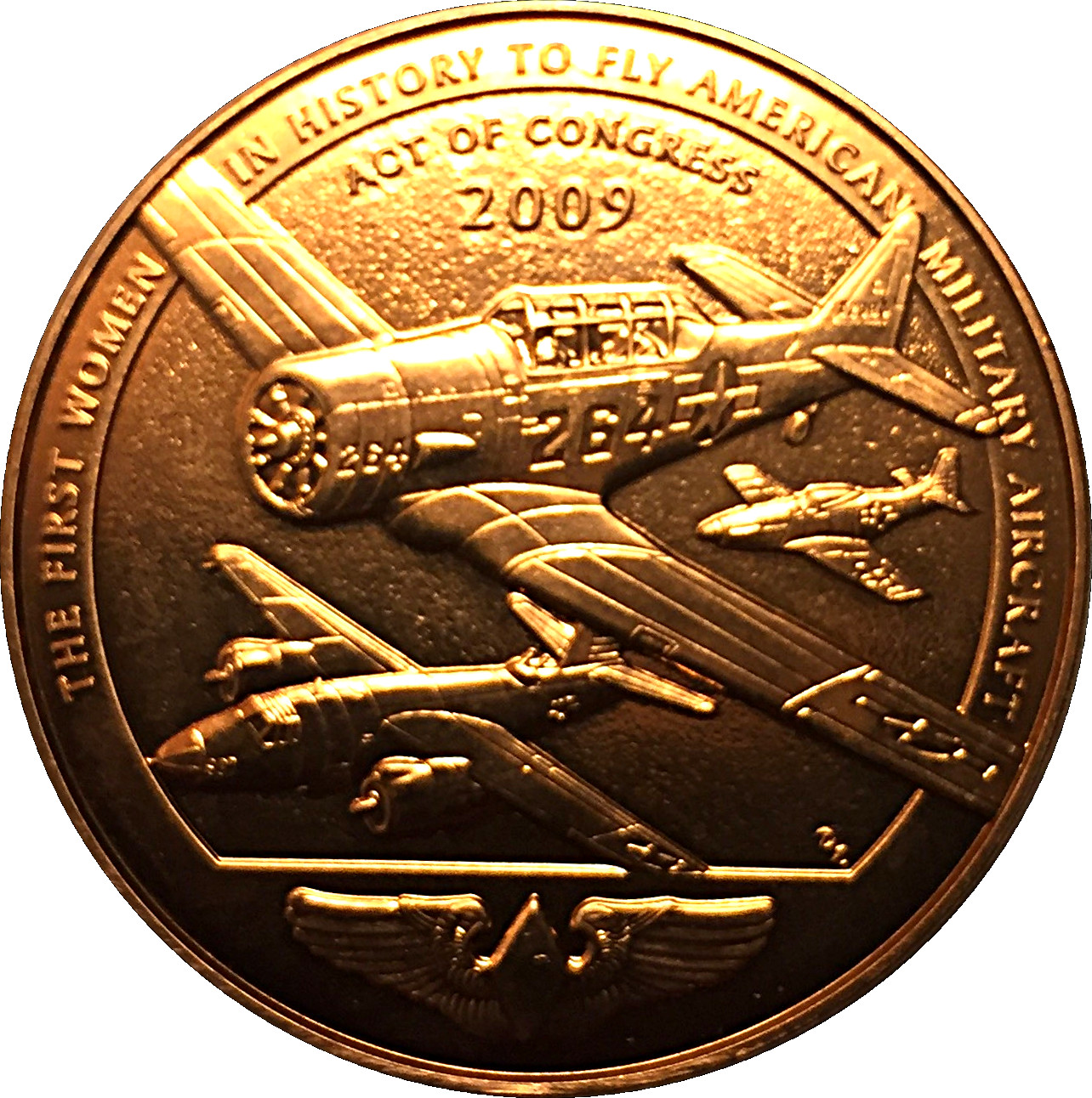 Описание: На аверсі зображено портрет WASP, а на передньому плані — трьох WASP у льотній формі, які йдуть до свого літака. На тлі зображено літак AT-6, який проривається крізь внутрішній обідок медалі.